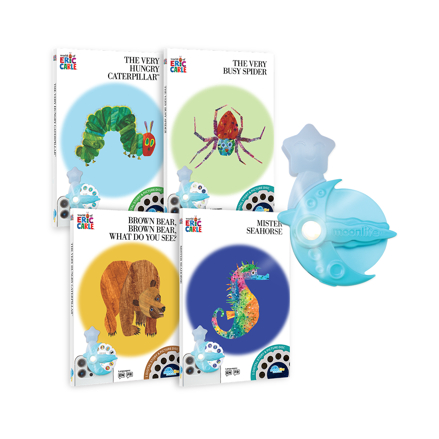 Moonlite Storytime transforms together time into a special experience for parents, caregivers, and children. The 4-Story Collection with Projector uses ambient music, playful sounds, and big, bright storybook images to tickle your child’s senses. Moonlite Storytime creates a magical and unique bonding experience that children love and parents look forward to.